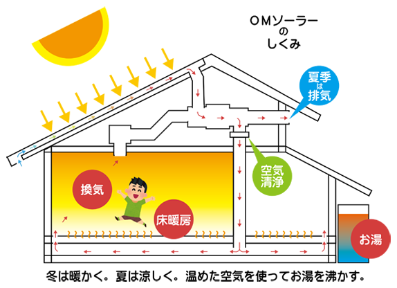 ■OMソーラーの仕組み:冬:外の冷たい外気を屋根に降り注ぐ太陽の熱で温め、